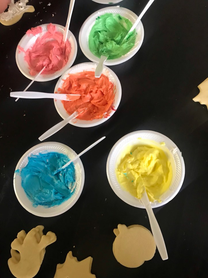 (Hint #3- divide up the frosting in DISPOSABLE BOWLS! Because nobody likes to clean up hard frosting and so you just have to toss it out when finished!)
