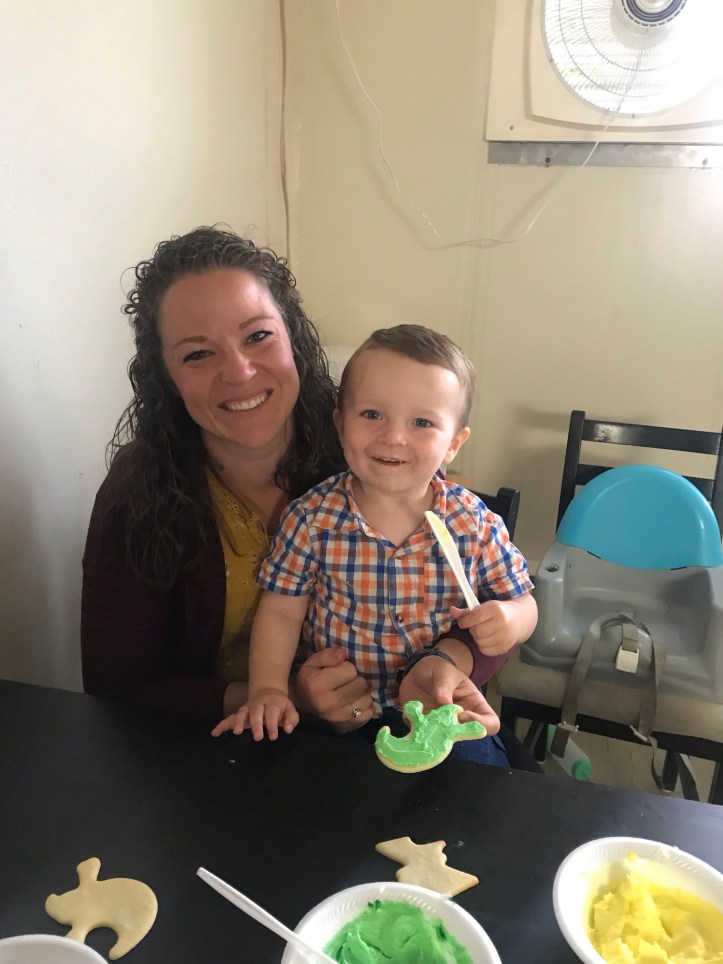 (Hint #2- this is a LIFESAVER!! Set up a “sprinkle station” and let the kids go to town with the sprinkles as long as it’s over the cookie sheet. This contained most of the sprinkles and then all I have to do was lift up my baking mat and pour them into a “surprise sprinkle” cup!)