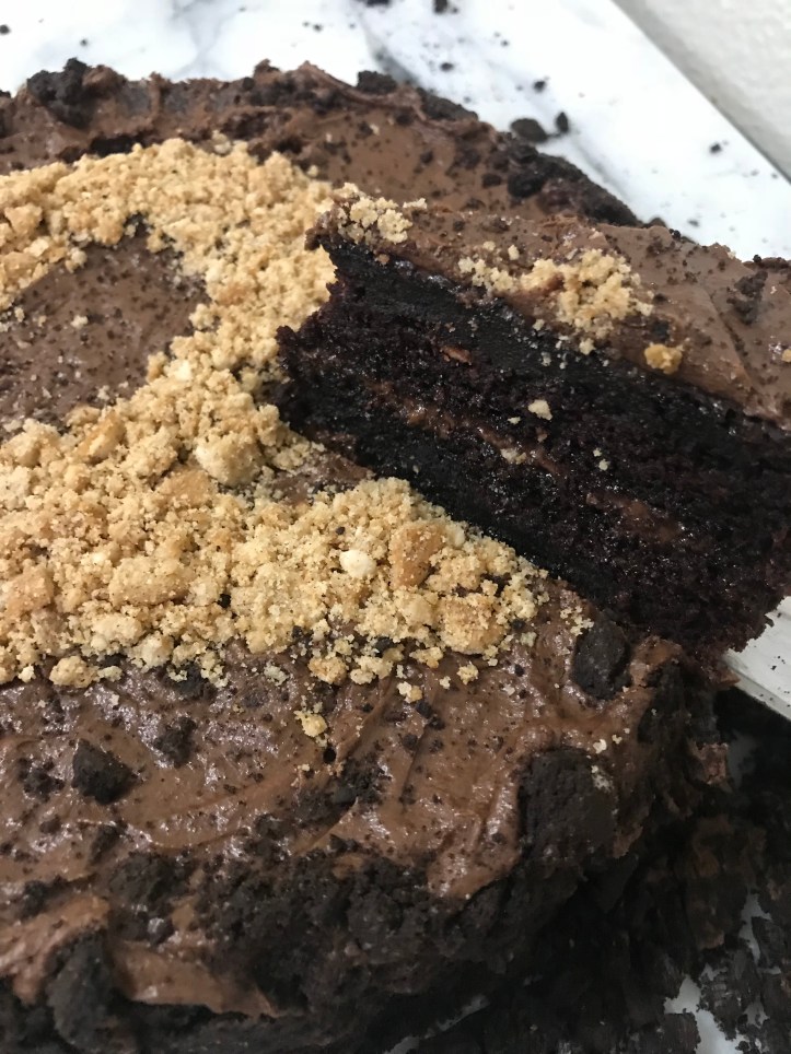 This year my little guy is turning 2 and so we made him a construction cake to celebrate. He is all boy and loves everything that moves and makes loud noises. We have a lot of road work outside our apartment right now and his favorite thing is to go outside and just watch all the dump trucks, bulldozers and excavators go by. When we showed him the cake… He LOVED IT!! The rich chocolate filled cake was perfect for the construction scene with Oreos for dirt and Cinnamon Sugar Oreos for the 2.