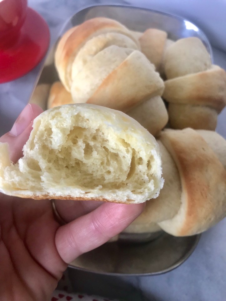 These rolls are like eating a roll made from clouds! They are super soft and flaky. The rich taste of buttery bread feels your mouth and leaves you wanting nothing more! I dare you to try and not eat the entire pan when they come out of the oven!!