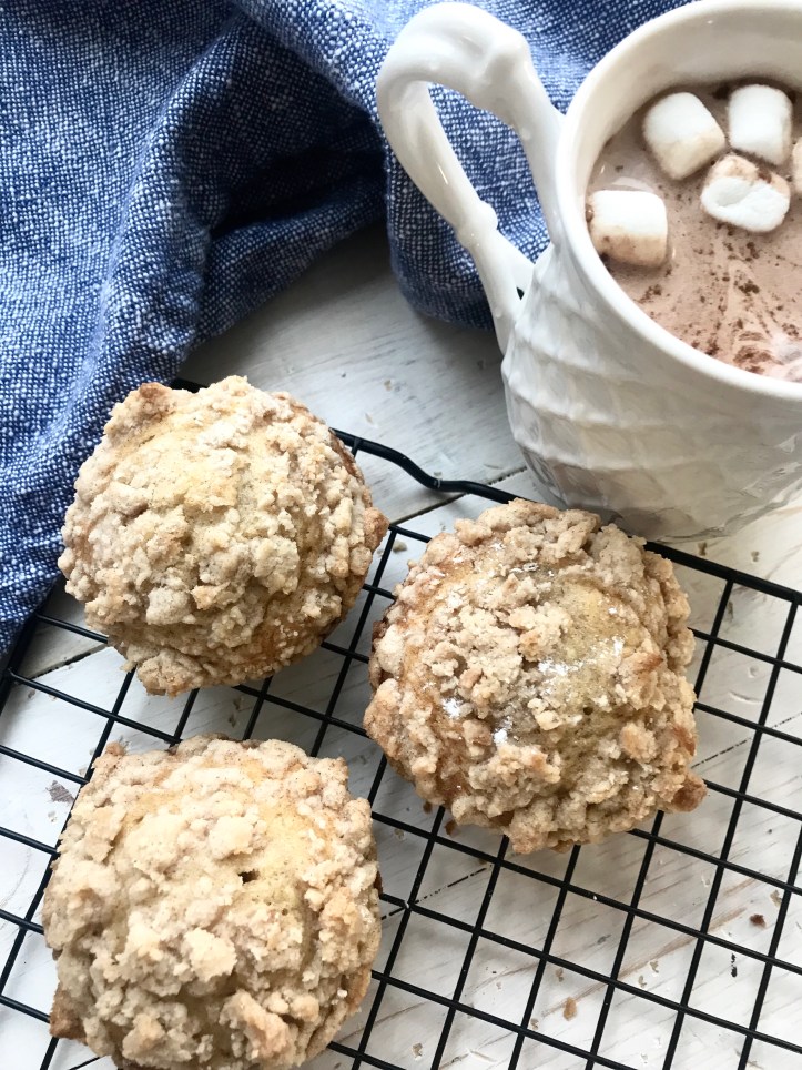 - Make the crumb topping by combining the powdered sugar, flour, cinnamon salt and melted butter. Using your hands, crumble the mixture over the batter in the pan. Bake in a pre-heated 350 degree oven for 45 – 50 minutes or until a toothpick comes out clean. Muffins will cook in about 18-20 minutes.