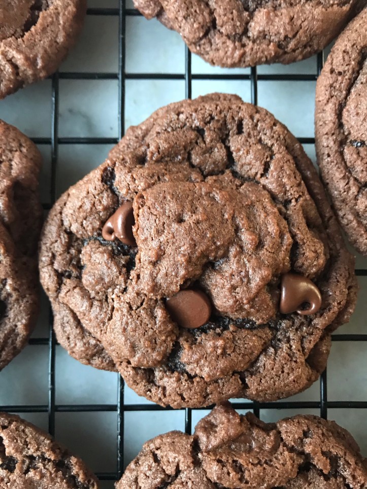 In a separate bowl whisk together the flour, cocoa, baking soda, baking powder, and salt. Gradually add the flour mixture to the sugar mixture and mix just until combined. Add the chocolate chips and then refrigerate the dough for 15-20 minutes.