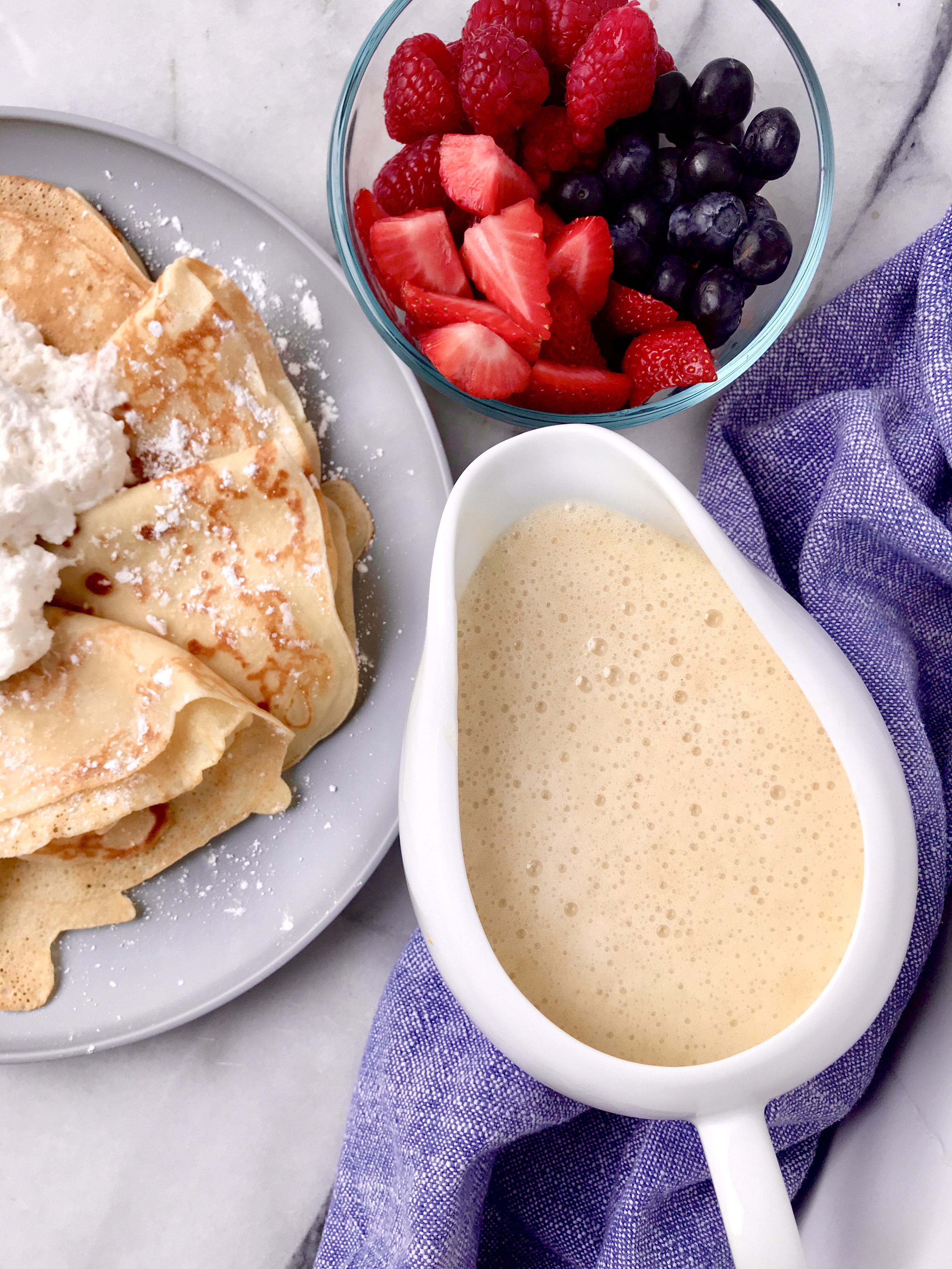 - In a blender, combine all of the ingredients and mix until batter is smooth (about 15-20 seconds). Refrigerate batter for at least 30 minutes, or overnight.