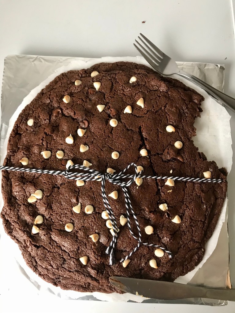 - If desired, top the cookie with additional chocolate chips. Bake for 13-15 minutes until the cookie is set around the edges and slightly crackly on top. (DONT OVER BAKE!!) Let the cookie cool COMPLETELY on the baking pan – this helps the cookie set up so it can be easily lifted off the pan. Once cool, cut around the cookie leaving the parchment paper underneath to help with transferring. Slide a foil covered cardboard circle or a cake circle (found in baking section of most craft stores) underneath the cookie. Tie up with ribbon or cut into slices and serve!