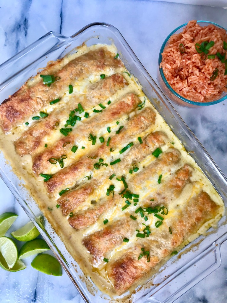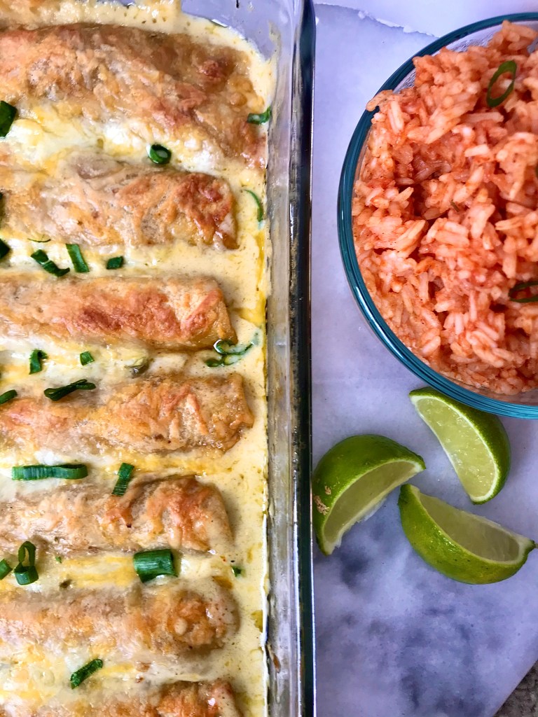 - Mix remaining enchilada sauce, cream and any leftover marinade (if there is any) together and pour over the rolled tortillas.