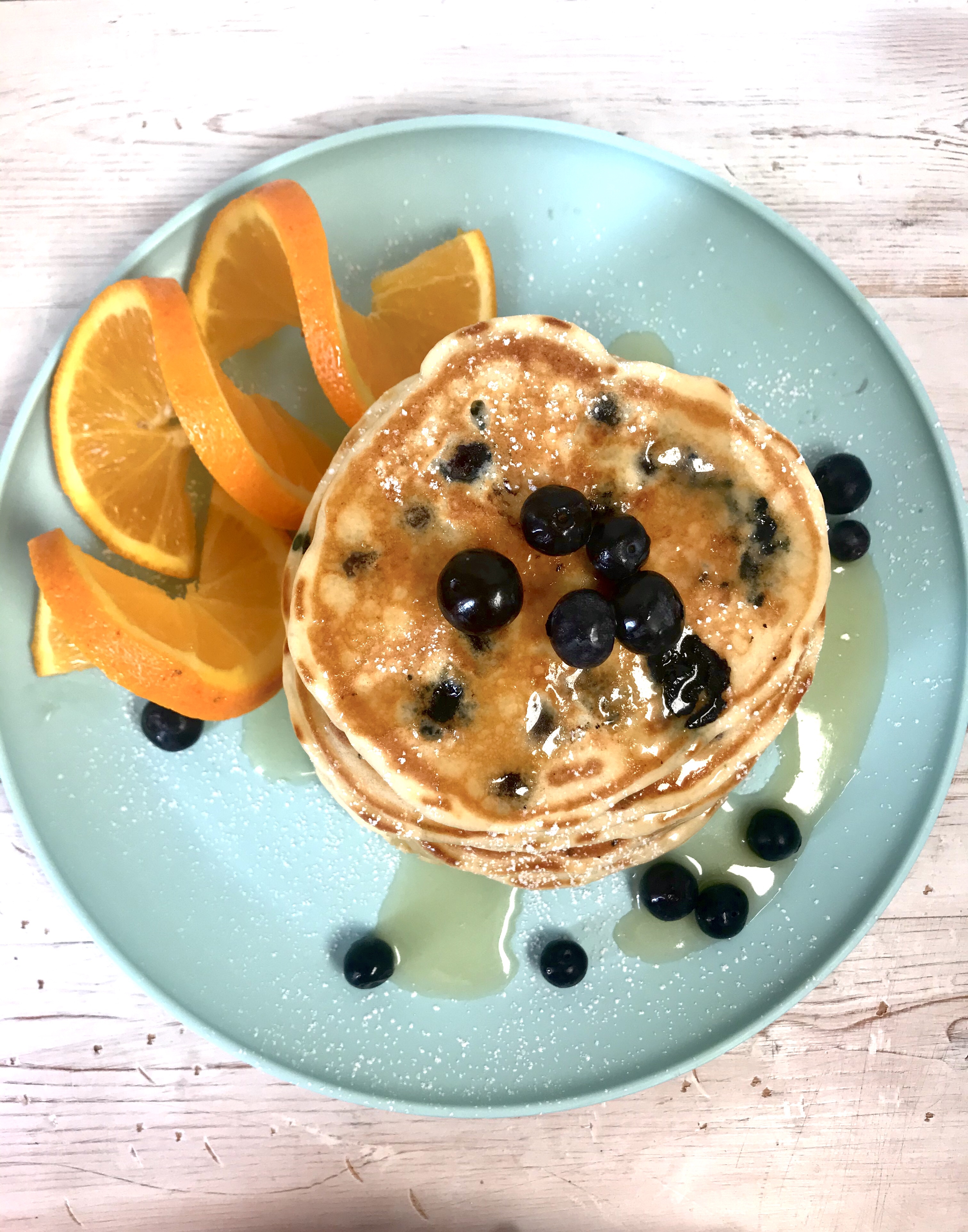 Growing up I always sprinkled the blueberries on after I had poured the batter, but this time I mixed them into the batter. And that’s made all the difference! It covered the blueberries enough with batter so that they wouldn’t explode all over the griddle.