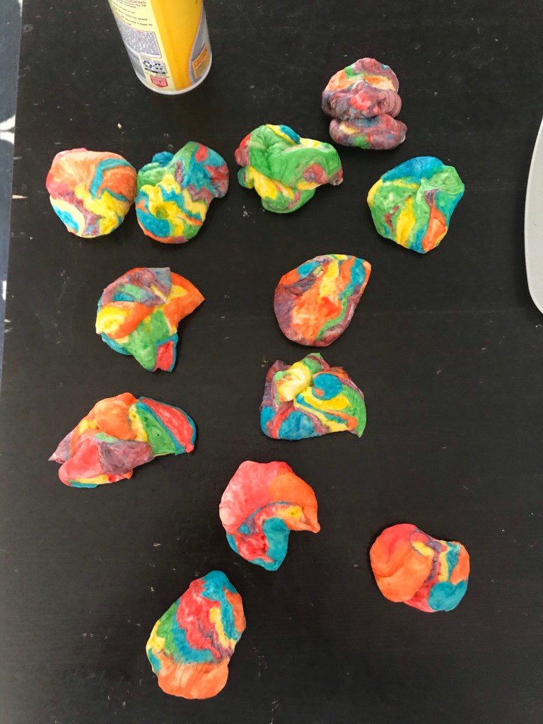 - Lightly grease a large bowl with oil or nonstick spray. Place all the sections of dough in the bowl, turning it to coat all sides in the oil. (I divided up my colors into two smaller sections before adding them all back into the bowl so that the colors would be more spread out)