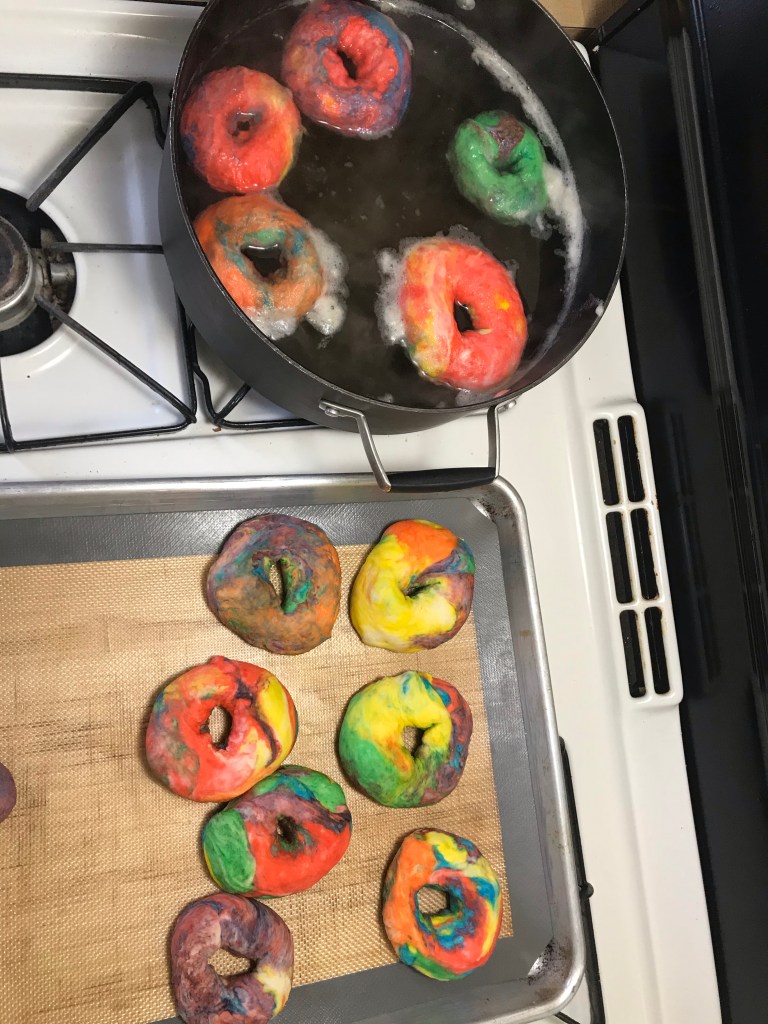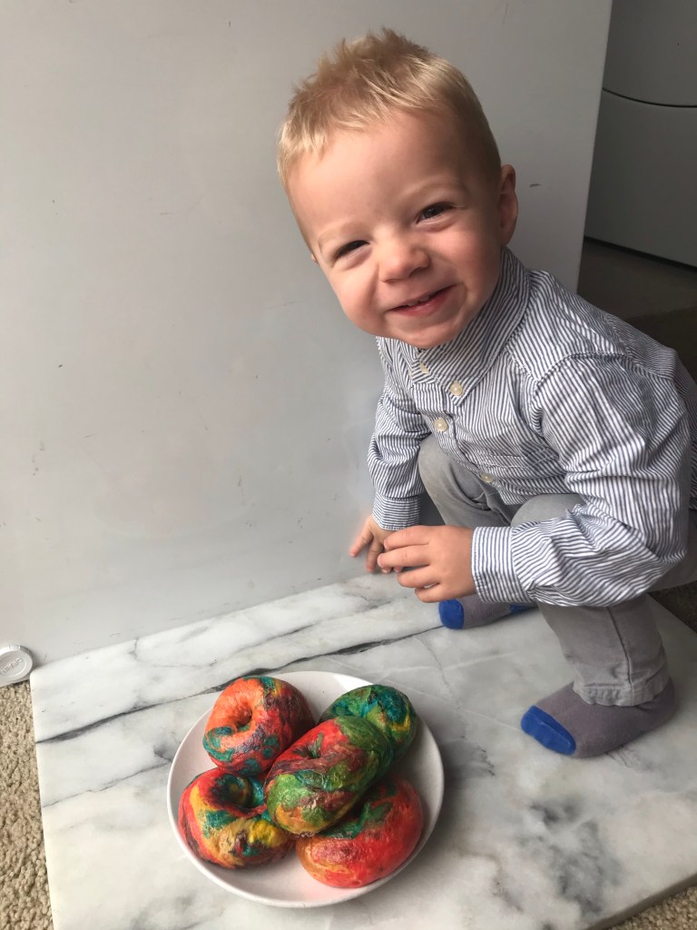 I always love doing a rainbow themed week around St Patrick’s Day. We always have rainbow pancakes for dinner with a “pot of gold” eggs and “fluffy clouds” of whipped cream. This year I decided to make something new and we tried these rainbow bagels!!