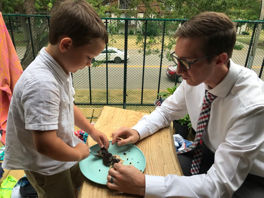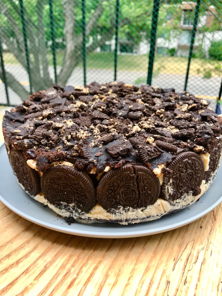 Ice cream cakes are rather simple. I always like to use brownies for my crusts because I am not a cake fan. Then I decided to make this one with all the things Trav loves: chocolate chip cookie dough, peanut butter, oreos and French vanilla ice cream. I was super excited to find a good recipe for “safe/edible” cookie dough. Feel free to experiment on your ice cream cake with whatever flavors you love!