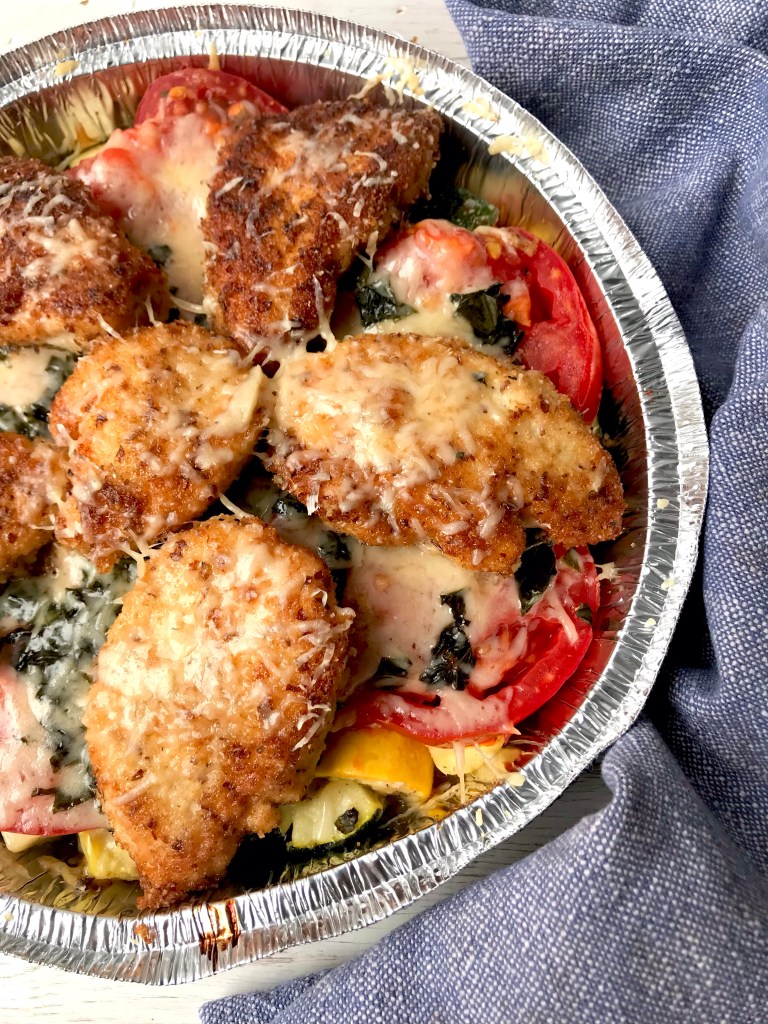 - Sprinkle the reserved breadcrumbs over the zucchini. Top with tomato slices; sprinkle with mozzarella cheese, basil and the remaining salt. Top with chicken. Cover and bake at 400° until a thermometer reads 165°, about 25 minutes. Uncover; sprinkle with remaining cheese. Bake until the cheese is melted, about 10 minutes.