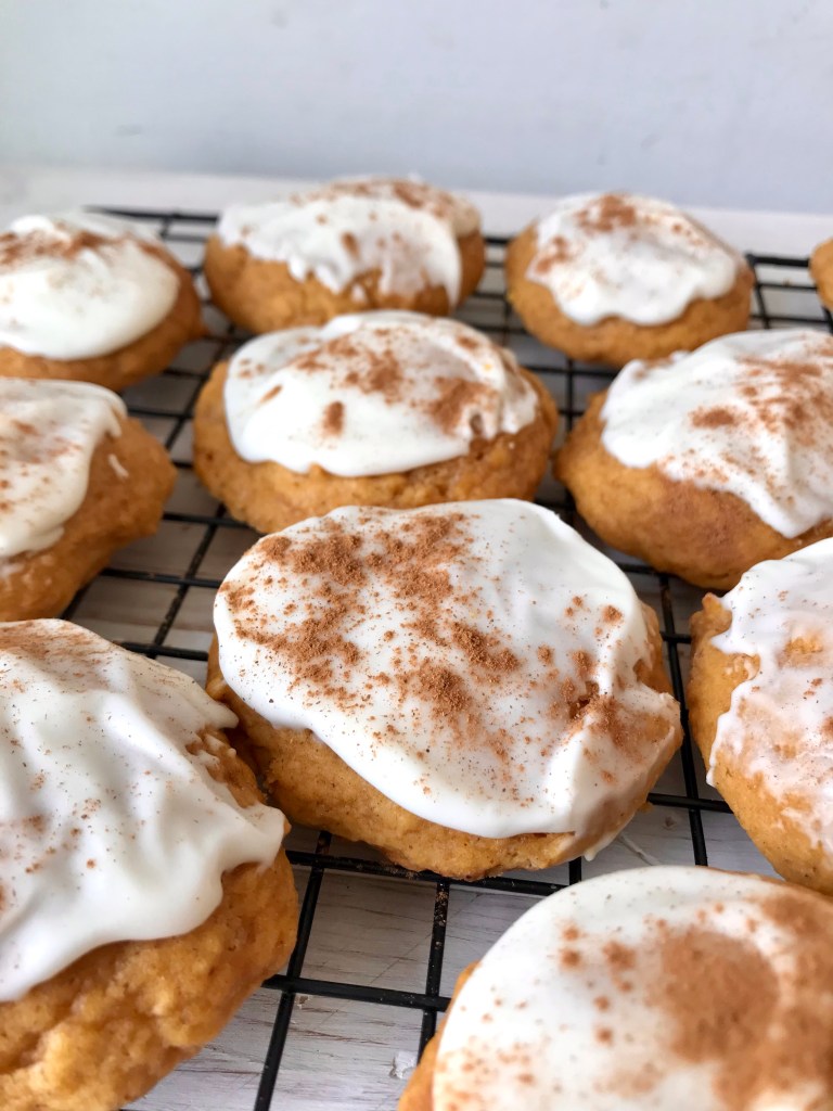 So I have a sister who is OBSESSED with pumpkin! Obviously pumpkin pie is her favorite but she lives for ALL THINGS pumpkin. Whenever I need a good pumpkin recipe, she is my go to. These pumpkin cookies did not let me down. They are so soft and the perfect combination of sweet yet full of spice. Then the cream cheese frosting makes it seem like you are eating a pumpkin roll in cookie form.