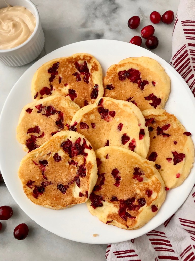 - Top each pancake with chopped cranberries. And cook for 2-3 minutes per side or until golden.