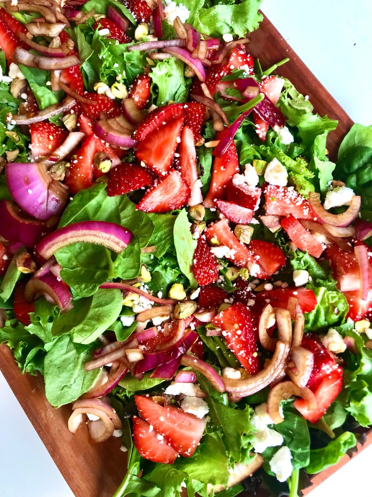 - Meanwhile, on a platter or salad plates arrange layer on greens. Top with strawberries, feta, pickled onions, and pistachios.