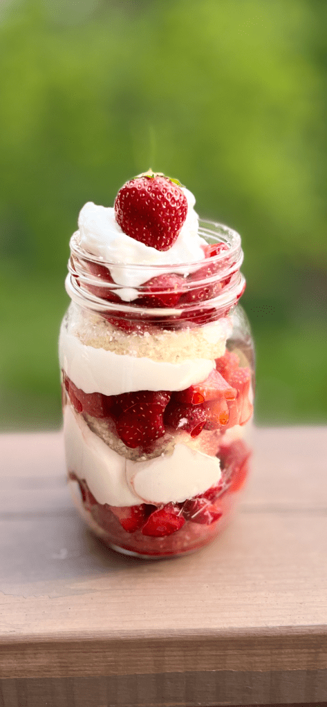 - Let the shortcake cool. Cut into circles with a biscuit cutter. Layer the bottom of the mason jar with a shortcake, top with a spoonful of strawberries and a dollop of whipped cream. Top with the other half of shortcake and top with additional berries and whipped cream. Continue until the jar is filled. Serve immediately.