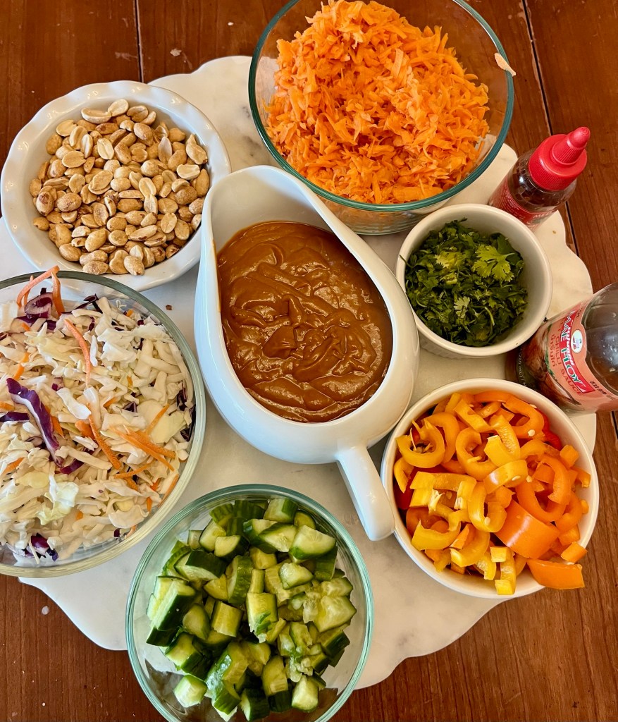One of my favorite go to meals for dinner is Thai Bowls. I love how you can include fresh or cooked veggies. Everyone can pick what they like to eat. And who doesn’t love a good peanut sauce?!